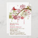 Adorable illustration of a cute birds with hat and scarf perched on a whimsical tree with red and green flowers, snowflakes and other design details.