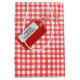 Red Birthday gift tag with striped string bow on red and white gingham pattern.