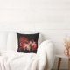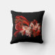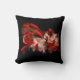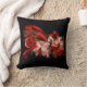 Red and white abstract design on a black throw pillow.