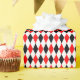 A wrapping paper designed with a red, black and white harlequin pattern. You can change the white for a different colour in an easy way.