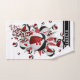 This fun basketball themed towel for her gear bag features an "explosion" of varied size red, black and white basketballs and red and grey star shapes on a white background - a pattern of tiny white polka dots covers the red star - customise with the athlete's monogram on the largest basketball and name on vertically orientated black varsity stripes - by katz_d_zynes