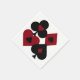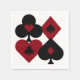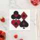 A set of napkins featuring a modern design that consists of the classic four french playing card suits (black clubs, red diamonds, red hearts & black spades) on a white background.