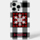 This modern and trendy black and white Buffalo Plaid cell phone case has a large white central snowflake on a red and black smaller plaid section, along with customisable text, making it perfect for a Christmas or winter birthday gift.