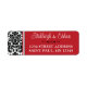 These black and white damask pattern wedding return address labels have a damask pattern on the left side with the text area in red that matches the wedding invitation set below. Your name(s) and return address are in white lettering with an ornate black scroll divider between them.