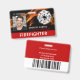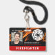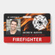 Modern Firefighter ID Badge. Design featuring fire flames on a black background, photo, bar code, station/department name, name and ID.