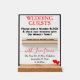 Wedding Guests is written in red typography. Please sign a Wooden Block details is written on top in black against clear lightly frosted look background. Frame outlined in black. With Love from is written in elegant red script. Insert Bride and Groom's Names and Wedding Date in black italics. Two red hearts at the bottom. NOTE: Wooden Tower block game sold separately, via my matching Collection theme. Fun wedding game to have guests sign a special note and build the wooden block tower as they arrive at the reception. Minimalist wedding reception table signage display. Original Artwork and Design by TamiraZDesigns.
