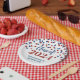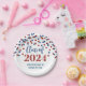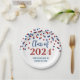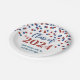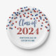 Customisable graduation party class of 2024 plates in red white and blue confetti pattern and elegant hand lettered style text.