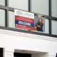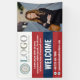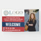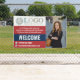 Promotional outdoors banner for your small business in red, white, and dark blue with a photo, your logo, your business website, and your phone number in white easy to read fonts against blue and red background. Red, white, and blue outdoors promo banner for your business personalised with logo and photo, along with your phone number and website with icons in blue and white against a red background. Outdoors marketing banner with your logo and a photo.