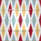 This fun mid-century modern fabric features 3 large diamonds with 2 stars in the centre, in a combination of the colours red, blue, and yellow. This would make a colourful addition to your sewing project.