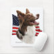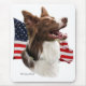 A happy red Border Collie headstudy in front of a waving American flag. Show your pride in your dog breed and your country!
