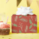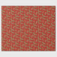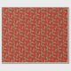 This gift wrap features a botanical design with leaves, holly, branches, wreaths and red berries against a rich red background.