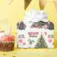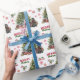 The repeated pattern on this Christmas wrapping paper includes an image of a black Cocker Spaniel dog wearing a festive red bow. The dog sits in front of a decorated Holiday tree. Stylised red and green text says MERRY CHRISTMAS", and your own signature is in two fields for you to customise. Other images included in the pattern include red decorative snowflakes, candy canes, and a peppermint lolly pop.