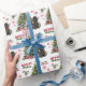 The repeated pattern on this Christmas wrapping paper includes an image of a beautiful black Standard Poodle Dog wearing a festive red bow. The dog sits in front of a decorated Holiday tree. Stylised red and green text says MERRY CHRISTMAS", and your own signature is in two fields for you to customise. Other images included in the pattern include red decorative snowflakes, candy canes, and a peppermint lolly pop.