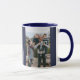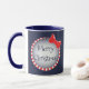 A Christmas mug that shows the greeting "Merry Christmas" (in blue) is a circle that is surrounded by a striped border and a red bow. The right side of the mug shows a template photo that is meant to be swapped out for your own. All of the text, including the name, can be customised.