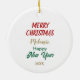 On the front of this Holiday ornament is an image of an adorable little Chihuahua dog looking out from a holly leaf, red berry, and pine needle wreath. The wreath is decorated with a bright red bow at the bottom. The back of the ornament has your custom text in red, gold and green. Make it say whatever you'd like!