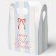 This coquette baby shower favor box features a red bow on a cream background with pale blue stripes. Personalize it for your needs. You can find matching products at my store.