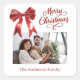 A white background, red text and a red bow. Text and photo. Merry Christmas is written with an elegant hand-lettered style font.