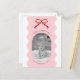 This design features modern Christmas card with a soft pink background and a deep red hand-drawn bow. The elegant scalloped edges and oval photo frame make it the perfect choice for showcasing your favourite family photo. Personalise with your family's name and photo.