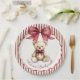 Make your baby shower extra special with these delightful red bow teddy bear paper plates. The centerpiece is a beautifully illustrated teddy bear, radiating cuteness and charm with its matching red bow. Encased within a decorative scalloped frame, the bear is set against a backdrop of cheerful red and white stripes. The charming phrase 'We can Bearly wait!' resonates with the excitement of a new arrival. These plates are designed to add a touch of sweet elegance and playful fun to your baby shower, ensuring a memorable celebration for parents and guests alike.