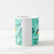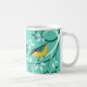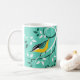 Stylised bird art on mugs of a nuthatch perched on branches shaped like swirls with leaf accents
