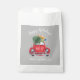 Watercolor graphic features retro red coloured beetle style car loaded on top with freshly cut Christmas tree and colourful wrapped presents. Customisable holiday greeting with room for your family or business name.