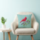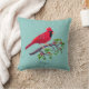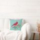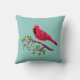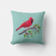 Beautiful red cardinal standing on a tree branch on teal background Pillow. Text, only on the front side, can be personalised.