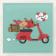 An illustration of a cute cartoon red cardinal lovers riding on a red scooter motorcycle while singing a love song. This kawaii bird couple design is a gift idea for heart lovers and valentines day lovers.