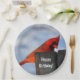 Paper plates with a photograph of a pretty red cardinal standing on a wooden stump. Custom text says Happy Birthday, which can be changed or deleted to suit your needs.