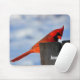 A custom mouse pad with a photograph of a pretty red cardinal standing on a wooden stump.