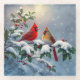 A pair of northern red cardinals perch on a holly branch covered with red berries and snow.