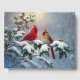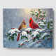 A pair of northern red cardinals perch on a holly branch covered with red berries and snow.