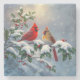 A pair of northern red cardinals perch on a holly branch covered with red berries and snow.