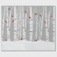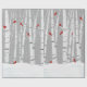 Red cardinals sitting in a white birch tree with snowflakes on grey and white background.