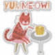 Sticker with funny red cat about to devour a stack of pancakes. Text says Yummeow!