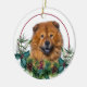 On the front of this Holiday ornament is an image of an orange red Chow Chow Dog peeking out of a holly and evergreen bough. Red berries and pine cones decorate the holly and pine sprigs. The image is placed on a white circle within a thin red line circle. The back of the ornament has the same evergreen bough wreath and circle with your custom text in red.