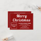 Merry Christmas! One of the most celebrated holidays of the year. It is also one of the best seasons to advertise your business or to promote your brand name to customers or clients. Red small flat greeting card for Christmas that you can customise by uploading your business logo, typing your business name, address, phone number, e-mail and website. Customise it and use it to greet your customers or clients this Christmas and as marketing material to advertise your business or to promote your brand name. You can also use it as an accessory of the packaging materials of your products. Customisable greeting card for Christmas that you can use to build brand name awareness. You can use it in December or Christmas in July. Please check the appearance of the front and back sides after uploading logo and typing texts. If the appearance is pleasing to you, you can place your order now. If you need to resize and reposition the logo and texts to fit on this card or on the size that you will choose, please adjust in the design tool. You can also change the background colour, font colour and font style in the design tool. Merry Christmas! Wishing you more sales this holiday.