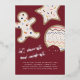 Invite kids of all ages to decorate Christmas cookies and celebrate the holiday season with this festive cookie decorating party invitation. Cookies in the shape of a gingerbread man, star, and circle are playfully decorated with frosting and a variety of colourful sprinkles. The illustration is placed on a red background with a speckled texture, and accompanied by the phrase "let's decorate and celebrate..." in foil-pressed, handwritten script lettering.