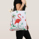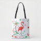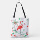 A fun, festive, flamingo design with a retro touch in red and green. A red flamingo wades in the water next to a palm tree decorated with Christmas baubles and ribbon. A customisable design for you to personalise with your own text, images and ideas. An original digital art image created by Jess Perry.