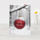 A vibrant red Christmas ornament suspended from a snow-dusted tree branch, bringing a touch of festive cheer to the serene beauty of a winter forest.
