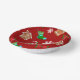Festive Red Christmas paper bowls that feature snowflakes, candy canes, gingerbread houses, bows, and Christmas stockings.