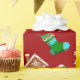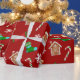 Wrap your Christmas gifts with this vibrant red wrapping paper that features snowflakes, candy canes, gingerbread houses, and Christmas stockings.
