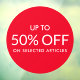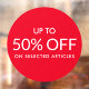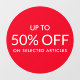Sale window cling with white, customisable text "up to 50% off on selected articles" on a red circle background. You can change the percentage in the template field and background colour with the design tool.