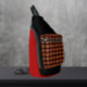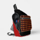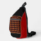 This two tone, black and red crossbody sling bag with zippered pocket goes where you go when biking and hiking and features on the front, zippered pocket the image of a red collarette Dahia flower printed in a repeating pattern on a solid, black background. A fun, floral design!
