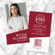 Maroon Red Contemporary Photo QR Code Logo Vertical Business Card. This contemporary vertical business card is designed for corporate professionals, small business owners, freelancers, and consultants who value clean, modern design. The front features a deep maroon or burgundy background with crisp white fonts, showcasing your photo, company logo, name, and title or business name in a bold and professional layout. The back continues the maroon and white aesthetic with your contact details, a scannable QR code for instant connections, and minimalist social media icons, paired with the phrase "Connect with us!" for a polished and approachable touch. The rich contrast of maroon and white, paired with clean typography, gives this card a refined and versatile style, perfect for any brand looking to leave a strong impression. Personalise yours today to stand out with confidence and style!