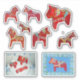 This sticker page features a collection of dala horse designs from photos of wooden dala horses, designed, carved and painted by Julia Persson Morrill