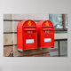 Two bright red mailboxes are mounted in a convenient location of shopping and restaurants in Copenhagen, Denmark,