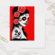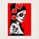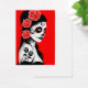 This Day of the Dead inspired design features a beautiful woman with sugar skull patterns on her face. Three roses appear in her jet black hair with two more roses tattooed on her arm. The girl is standing sideways with her head turned slightly towards the viewer. Her pure white skin really stands out against the black hair and dress as well as the bright red background. This unique design is a stunning representation of this Day of the Dead woman.