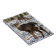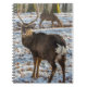 Wild red deer in a snowy woodland landscape with the stag looking directly at the camera.