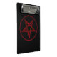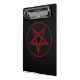 Red, inverted, textured pentagram in circle, on black background. Occult symbol. 666