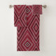 This contemporary bath towel design features a sophisticated, modern, geometric chevron abstract pattern of black, grey and white diamonds on a red background.